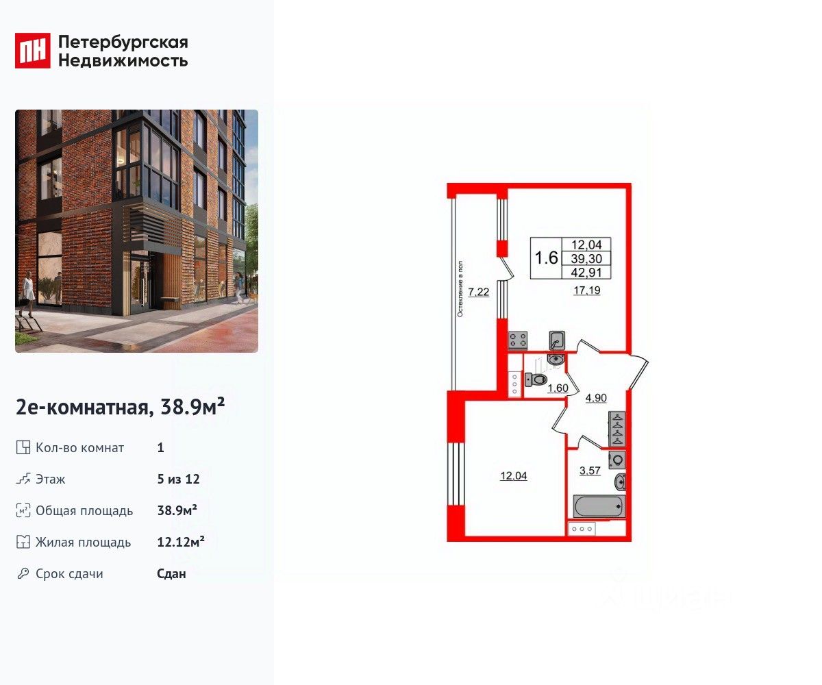 Удобная, классическая, функциональная европланировка, большая кухня-гостиная 17.36 м², просторная прихожая 5.03 м². Общая площадь квартиры - 38.9 м², жилая 12.12 м², высота потолка 2.77 м.