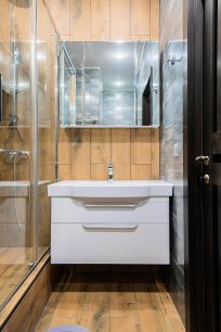 Общая площадь составляет 44 кв. м, с уютной кухней площадью 16 кв. м. Потолки высотой 2,7 метра и балкон 10 метров обеспечивают много света и воздуха.
