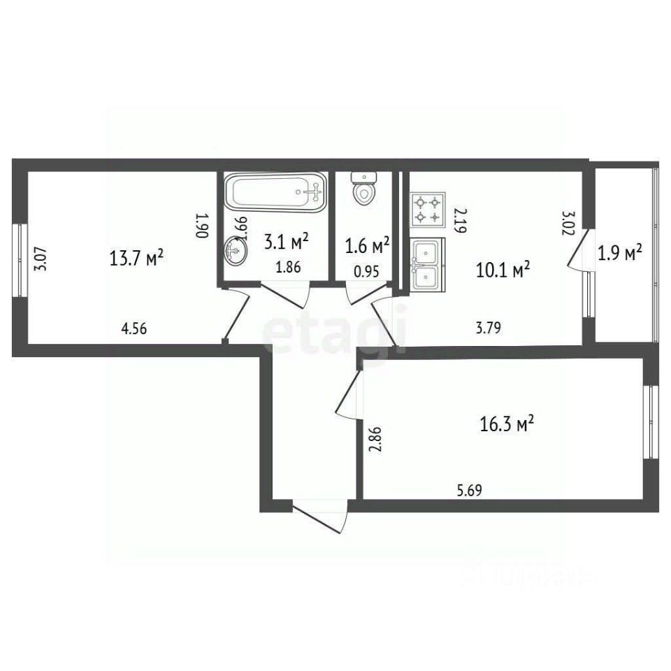 Площадь кухни 10,1 м². Две изолированные комнаты 16,3 м² и 13,7 м².