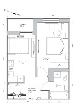 На лоджии тёплый пол и светильник, комфортно в межсезонье. В комнате предполагается большая кровать, напротив экран, по краям тумбочки, широкий шкаф. Есть место и для стола. Люстра на пульте управления с выбором белого цвета и яркости.