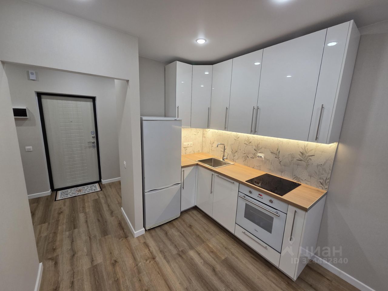 Сверкающая фасадами эргономичная кухня по принципу рабочего треугольника. Новая бытовая техника на гарантии: духовка, посудомоечная машина, широкая мойка, а над стеклокерамической варочной вытяжка. Верхние шкафы до потолка, выдвижная бутылочница. Холодильник в нише (б/у, исправен, для антуража). Скрытая подсветка, 4 розетки. Вы первыми приготовите на этой новой кухне праздничный ужин.