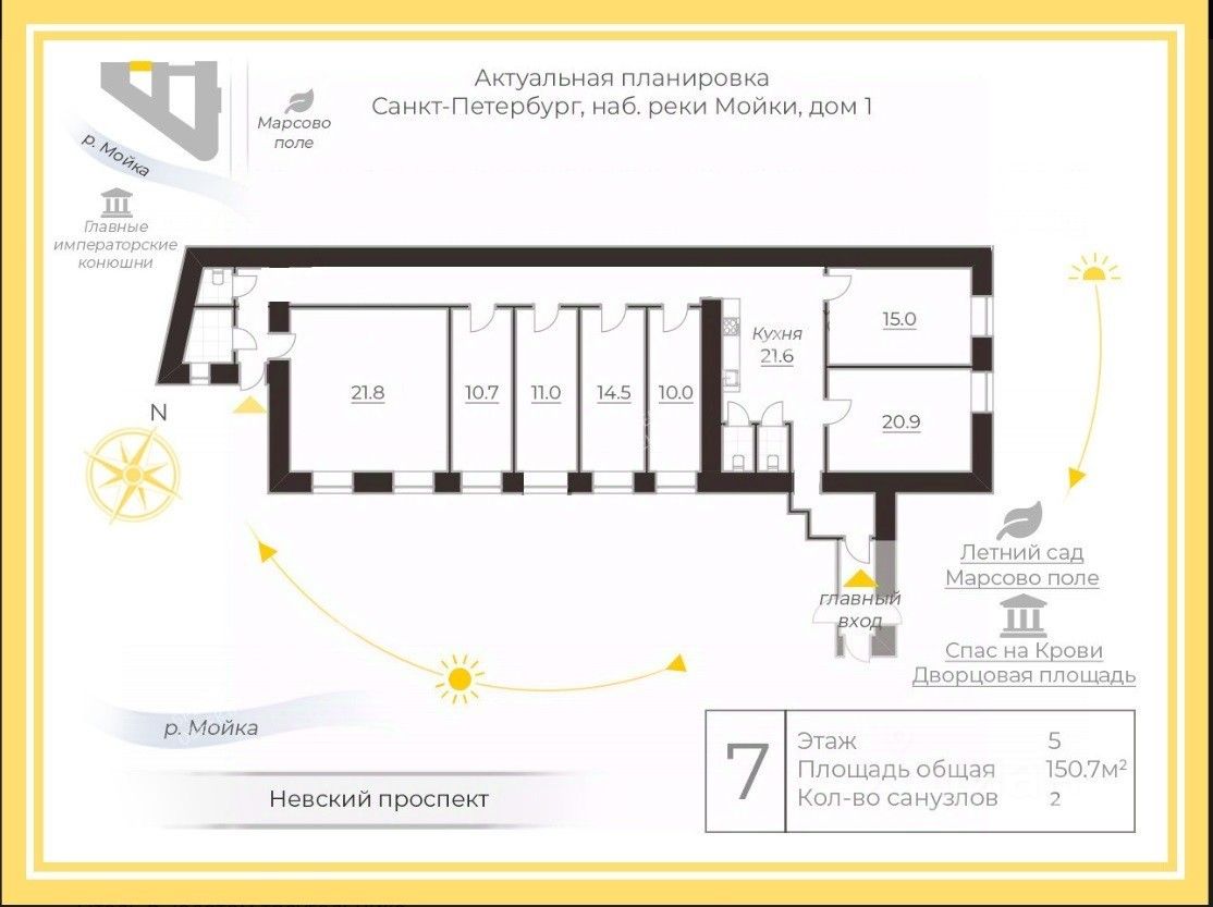 Это здание считается одним из самых интересных памятников архитектуры и привлекает внимание благородной отделкой фасадов, украшенных портиками из восьми полуколонн композитного ордера и лепным фризом. Живописный силуэт Михайловского замка, вековые деревья Летнего и Михайловского садов, тихая поэтичная Мойка делают это место одним из красивейших мест в городе. Квартира 151 кв.м. расположена на последнем этаже пятиэтажного дома. Окна квартиры смотрят в тихий двор.