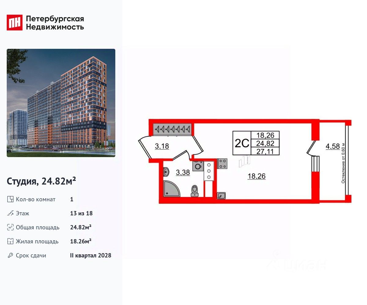 Удобная, классическая, функциональная европланировка, просторная прихожая 3.18 м². Общая площадь студии - 24.82 м², жилая 18.26 м², высота потолка 2.77 м.