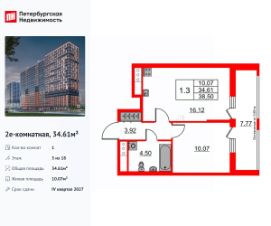 Удобная, классическая, функциональная европланировка, большая кухня-гостиная 16.12 м², вместительная прихожая 3.92 м². Общая площадь квартиры - 34.61 м², жилая 10.07 м², высота потолка 2.77 м.
