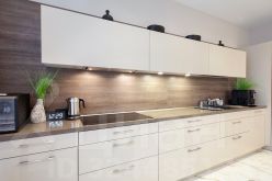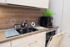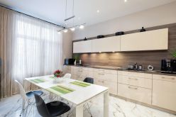 К гостиной примыкает кухня, обустроенная качественной немецкой мебелью LEICHT. Кухня оборудована встроенной техникой премиального бренда Kuppersbusch: