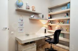 Детская комната с качественной встроенной мебелью: гардеробный шкаф со стеллажом, широкий письменный стол, кровать.
