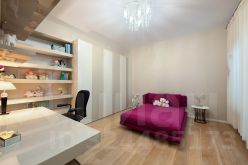Приватная спальня удалена от остальных комнат. В ней предусмотрены вместительные гардеробные шкафы, большая кровать и выход на остекленную благоустроенную лоджию (с дополнительными местами для хранения).