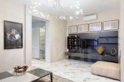 Интерьер квартиры выполнен по дизайн-проекту с применением качественных импортных материалов. Пол в комнатах из натуральной паркетной доски, гостиная и кухня керамогранит с подогревом.