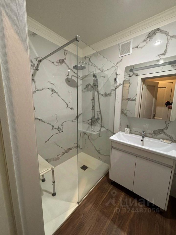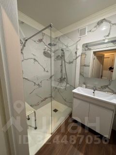 • Современная ванная комната с душевой, стеклянной перегородкой и качественной отделкой (керамогранит под мрамор, новая сантехника).