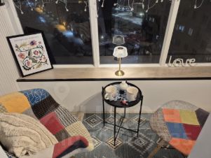 * Лоджия: панорамное остекление, 2 кресла, журнальный столик, бра, текстиль.