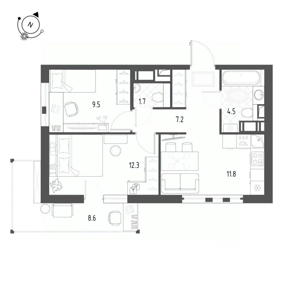Продается квартира 509, по адресу г. Санкт-Петербург, поселок Шушары, Школьная улица, стр.1, корпус ЖК Монография в Монография на 9 этаже, с площадью 49.5 м2.