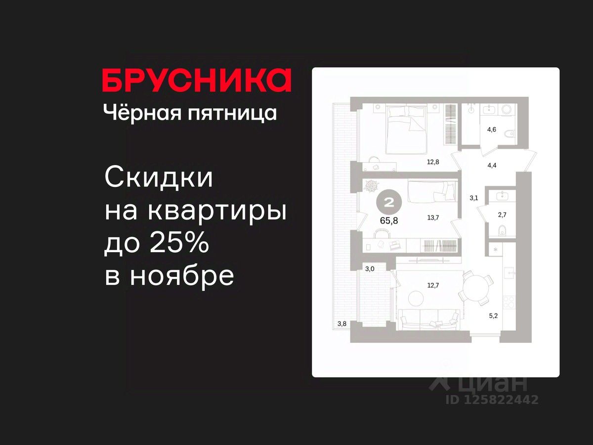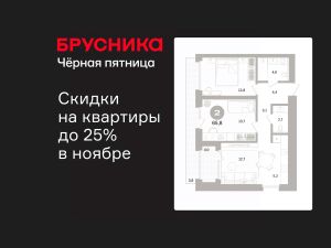 2-комн. квартира от застройщика с предчистовой отделкой в ЖК "Северный ветер" на 2 этаже. Общая площадь: 65.84 кв.м. Высота потолков 3.1 м.