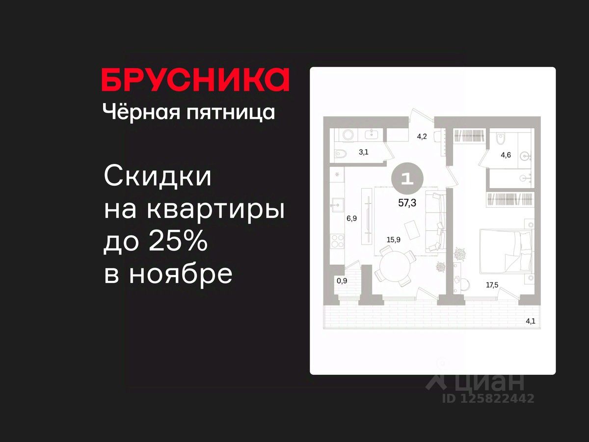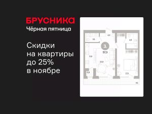 Однокомнатная квартира с предчистовой отделкой в ЖК "Северный ветер" на 2 этаже. Общая площадь: 57.29 кв.м. Высота потолков 3.1 м.