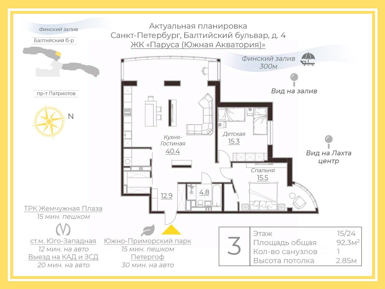 Шаговая доступность до Финского залива и живописных парков. Отличная транспортная доступность и близость к будущей станции метро Юго-Западная. Развитая инфраструктура района, включая школы, поликлиники и ТРК "Жемчужная Плаза".