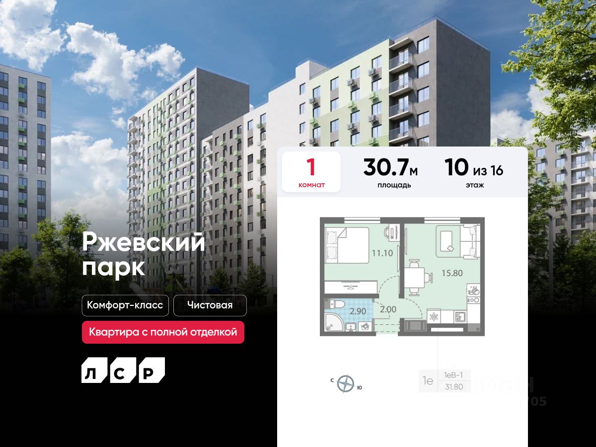 Продается 1-комнатная квартира в ЖК "ЛСР. Ржевский парк" на 10 этаже. Общая площадь составляет 30.70 кв. м. Квартира с чистовой отделкой. Жилой комплекс "ЛСР. Ржевский парк" располагается по адресу Ленинградская область, Всеволожский район, Ковалёво пос..