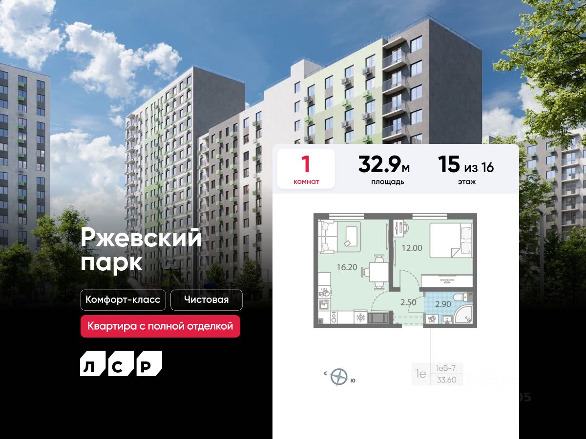 Продается 1-комнатная квартира в ЖК "ЛСР. Ржевский парк" на 15 этаже. Общая площадь составляет 32.90 кв. м. Квартира с чистовой отделкой. Жилой комплекс "ЛСР. Ржевский парк" располагается по адресу Ленинградская область, Всеволожский район, Ковалёво пос..