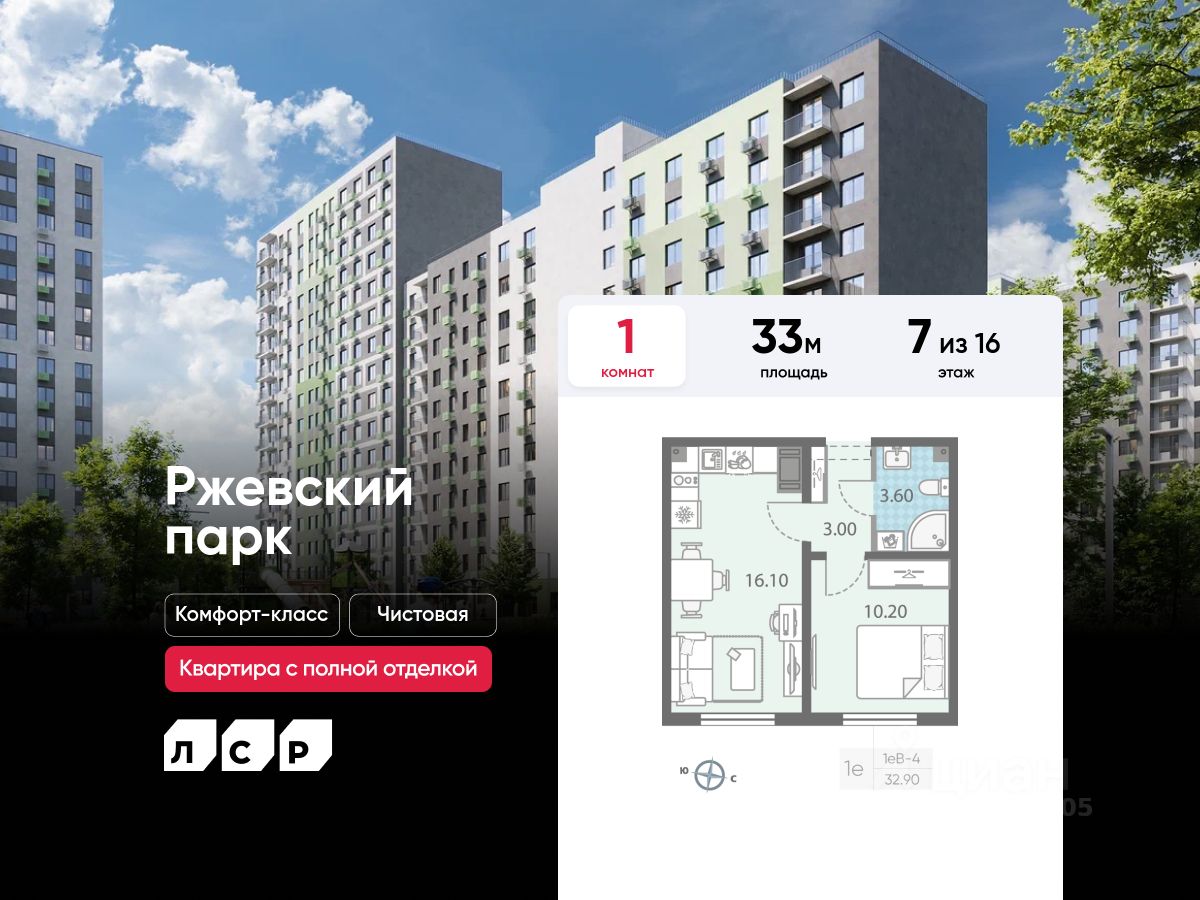 Продается 1-комнатная квартира в ЖК "ЛСР. Ржевский парк" на 7 этаже. Общая площадь составляет 33.00 кв. м. Квартира с чистовой отделкой. Жилой комплекс "ЛСР. Ржевский парк" располагается по адресу Ленинградская область, Всеволожский район, Ковалёво пос..