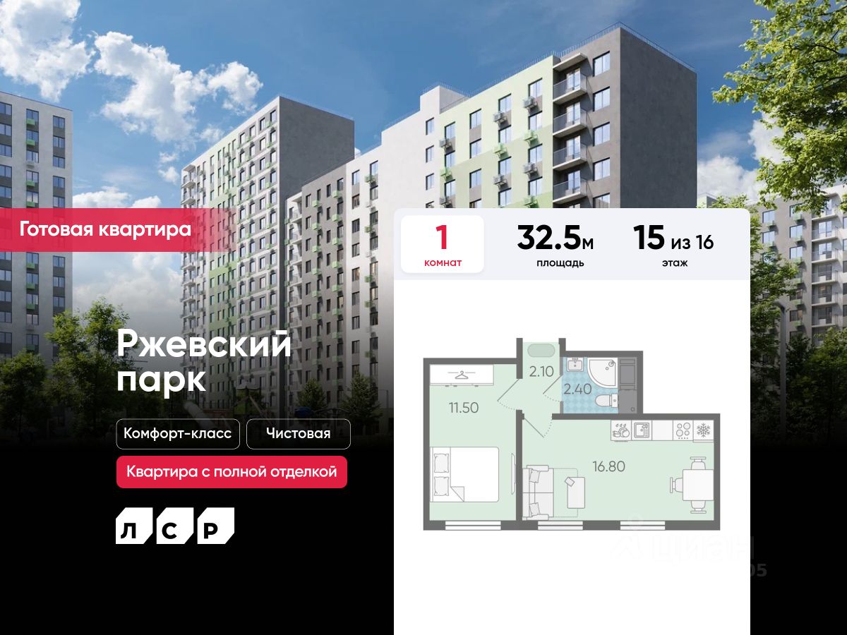 Продается 1-комнатная квартира в ЖК "ЛСР. Ржевский парк" на 15 этаже. Общая площадь составляет 32.50 кв. м. Квартира с чистовой отделкой. Жилой комплекс "ЛСР. Ржевский парк" располагается по адресу Ленинградская область, Всеволожский район, Ковалёво пос..