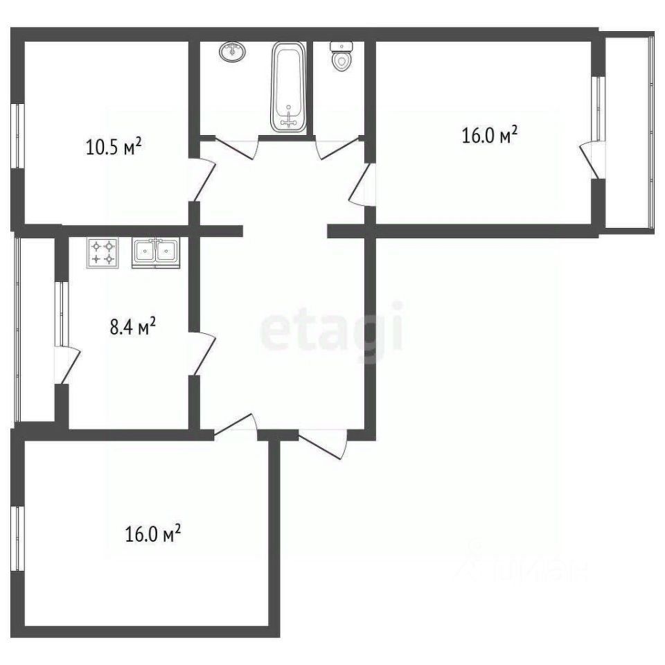Три изолированные комнаты (16 м2, 16 м2 и 10,5 м2).