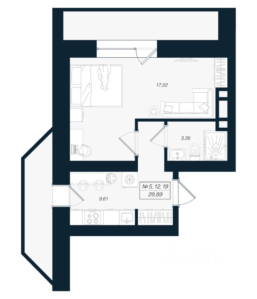 Однокомнатная квартира - 34,64 м2. Удобная планировка, 2 балкона.
