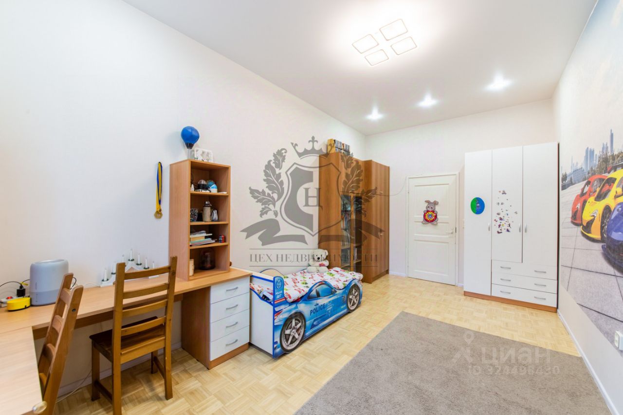 Квартира расположена на 3 этаже общей площадью 137,7 кв.м. В квартире 5 комнат: просторная гостиная с эркером, две детские, спальня с выходом на балкон, кабинет, уютная кухня-столовая, и раздельный санузел. Высокие потолки 3,23м. На окнах финские двойные рамы из натурального дерева. На полах финский паркет в идеальном состоянии (ранее заменены лаги). Несколько лет назад меняли межкомнатные двери, трубы, проводку, и ровняли стены. Балкон с кованой балюстрадой после реставрации. Из окон квартиры открывается великолепный вид на сквер, утопающий в зелени многовековых деревьев, и в просторный закрытый двор, с местами для парковки.