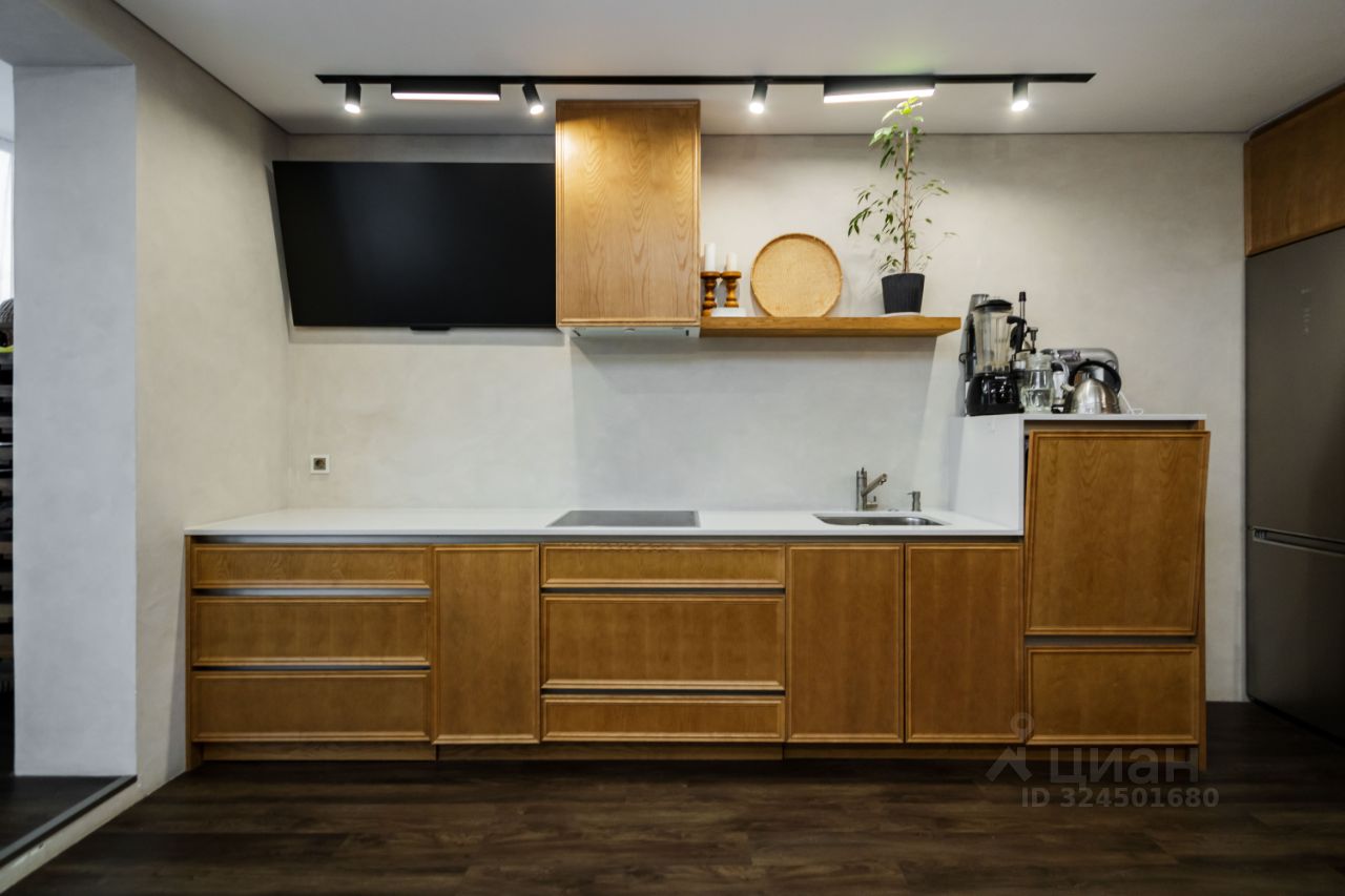 Большая кухня-гостиная 28,5 м² с панорамным остеклением и всей необходимой встроенной техникой (холодильник, плита, духовой шкаф, посудомоечная и микроволновая печь).