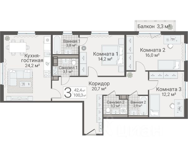 В комплексе представлены квартиры различных планировок: от студий площадью 30 м до трёхкомнатных квартир 100 м. Все квартиры отличаются продуманной планировкой, отвечающей требованиям современной семьи. В каждом варианте предусмотрены просторные кухни-гостиные площадью от 15 м до 31 м. Некоторые двухкомнатные квартиры оборудованы окнами в ванных комнатах, а в трёхкомнатных квартирах обязательно предусмотрены два санузла.