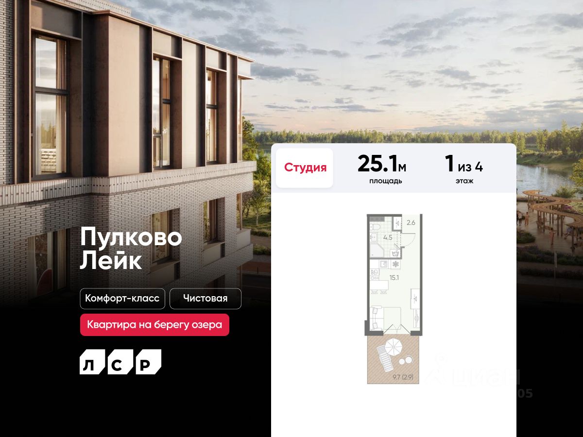 Продается студия в ЖК "Пулково Лейк" на 1 этаже. Общая площадь составляет 25.10 кв. м. Квартира с чистовой отделкой. Жилой комплекс "Пулково Лейк" располагается по адресу Санкт-Петербург, Московский.