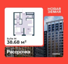 Однокомнатная квартира от застройщика с предчистовой отделкой в ЖК "Новая Земля" на 12 этаже. Общая площадь: 38.68 кв.м., жилая: 9.65 кв.м., площадь просторной кухни-столовой: 14.56 кв.м. Все окна выходят на одну сторону. В квартире один раздельный санузел. Высота потолков 2.85 м.