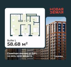 Просторная 2-комн. квартира с предчистовой отделкой в ЖК "Новая Земля" на 15 этаже. Общая площадь: 58.68 кв.м., жилая: 20.83 кв.м., площадь просторной кухни-столовой: 21.74 кв.м. Комнаты изолированные, все окна выходят на одну сторону. В квартире один раздельный санузел. Высота потолков 2.85 м.