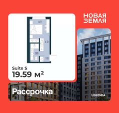 Продается однокомнатная квартира-студия от застройщика с предчистовой отделкой в ЖК "Новая Земля" на 2 этаже. Общая площадь: 19.59 кв.м., площадь гостиной 13.87 кв.м., из которых 4.1 кв.м. выделено под кухонную зону. Все окна выходят на одну сторону. В квартире один совмещенный санузел. Высота потолков 2.85 м.