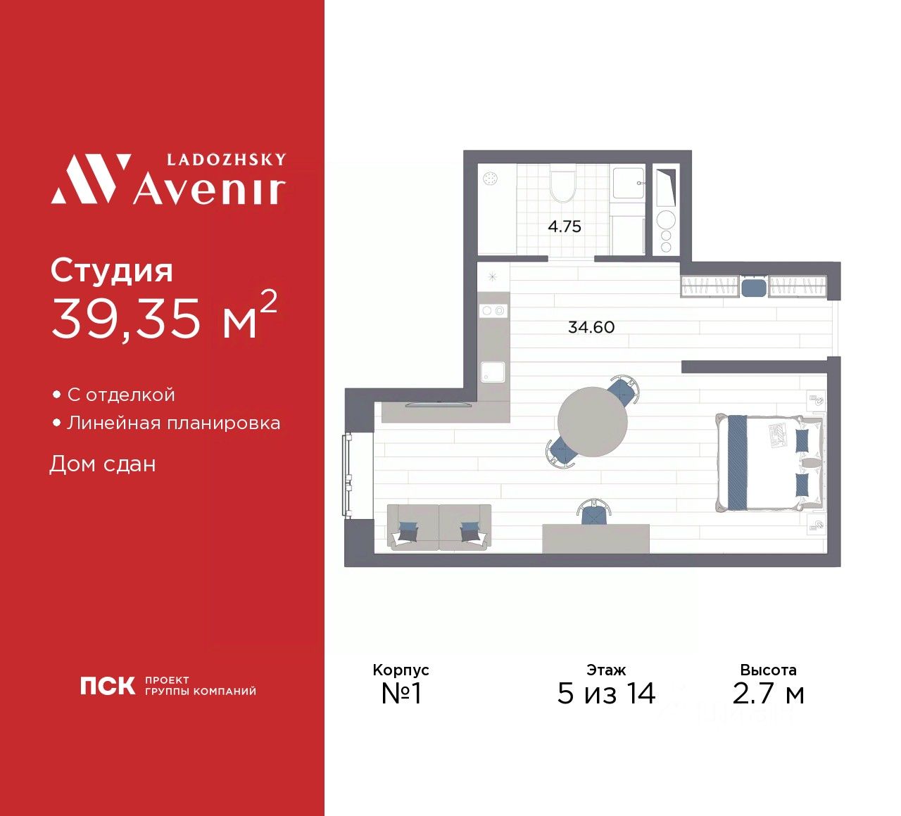 1-комн. апартаменты-студия с отделкой в ЖК "Ladozhsky AVENIR" на 5 этаже. Общая площадь: 39.35 кв.м., площадь гостиной 34.6 кв.м., из которых 5 кв.м. выделено под кухонную зону. Все окна выходят на одну сторону. В апартаментах один совмещенный санузел. Высота потолков 2.7 м.