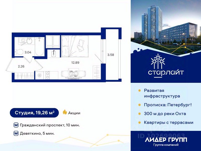 Скидка 1% жителям района. Жилой комплекс комфорт-класса "Старлайт" в Красногвардейском районе Санкт-Петербурга. В 300 метрах от берега реки Охта у Новоохтинского парка. Новая большая школа прямо рядом с домом! Это зеленый активно развивающийся и благоустраиваемый квартал Петербурга, где природный ландшафт идеально сочетается с хорошей транспортной доступностью и развитой, сложившейся инфраструктурой. Проект состоит из двух устремленных ввысь 25-этажных современных башен и 7-ми этажного корпуса переменной этажности с индивидуальными террасами. Жилые корпуса объединены галереей-стилобатом, в которой будут располагаться магазины, пекарни, аптеки и салоны красоты. Двор закрыт от посторонних и приподнят, что обеспечит дополнительную приватность проживания. Во дворе будет выполнено авторское благоустройство, в том числе уникальная проекция звездного неба