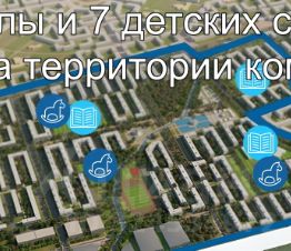 • В шаговой доступности — всё, что важно для комфортной жизни: торгoвые и бытовые объекты, торговые и сервисные точки, будущие школы, детсады.