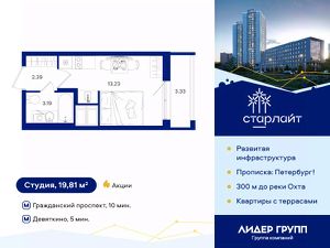 Скидка 1% жителям района. Жилой комплекс комфорт-класса "Старлайт" в Красногвардейском районе Санкт-Петербурга. В 300 метрах от берега реки Охта у Новоохтинского парка. Новая большая школа прямо рядом с домом! Это зеленый активно развивающийся и благоустраиваемый квартал Петербурга, где природный ландшафт идеально сочетается с хорошей транспортной доступностью и развитой, сложившейся инфраструктурой. Проект состоит из двух устремленных ввысь 25-этажных современных башен и 7-ми этажного корпуса переменной этажности с индивидуальными террасами. Жилые корпуса объединены галереей-стилобатом, в которой будут располагаться магазины, пекарни, аптеки и салоны красоты. Двор закрыт от посторонних и приподнят, что обеспечит дополнительную приватность проживания. Во дворе будет выполнено авторское благоустройство, в том числе уникальная проекция звездного неба