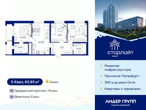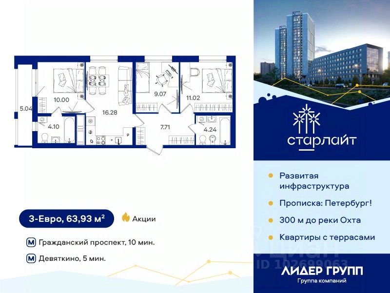 Скидка 1% жителям района. Жилой комплекс комфорт-класса "Старлайт" в Красногвардейском районе Санкт-Петербурга. В 300 метрах от берега реки Охта у Новоохтинского парка. Новая большая школа прямо рядом с домом! Это зеленый активно развивающийся и благоустраиваемый квартал Петербурга, где природный ландшафт идеально сочетается с хорошей транспортной доступностью и развитой, сложившейся инфраструктурой. Проект состоит из двух устремленных ввысь 25-этажных современных башен и 7-ми этажного корпуса переменной этажности с индивидуальными террасами. Жилые корпуса объединены галереей-стилобатом, в которой будут располагаться магазины, пекарни, аптеки и салоны красоты. Двор закрыт от посторонних и приподнят, что обеспечит дополнительную приватность проживания. Во дворе будет выполнено авторское благоустройство, в том числе уникальная проекция звездного неба