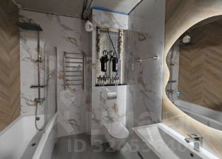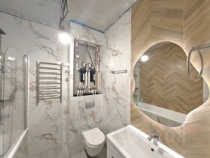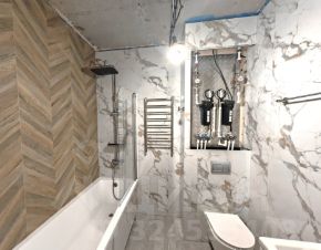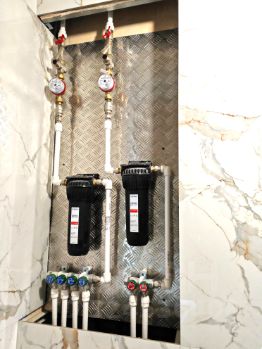 Выполнены самые сложные работы - оборудование санузлов. Отделка крупногабаритным керамогранитом с запилом углов, установлены инсталляции, фильтры на каждый стояк.