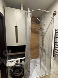 • В санузле максимально использовано пространство, тропический душ, инсталяция, стиральная машина, шкафчик, раковина с зеркалом.