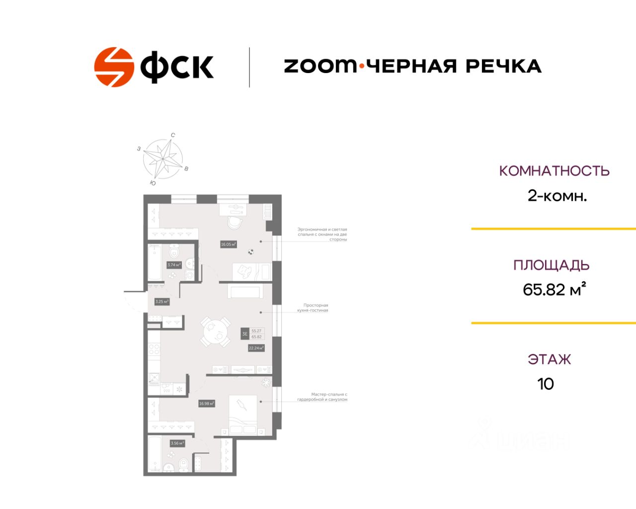 Цена со специальной скидкой в прямой продаже от застройщика — только в этом месяце. 2-к апартамент в комплексе класса бизнес-лайт Zoom Чёрная Речка на 10-м этаже. Общая площадь 65,82. Чистовая отделка.