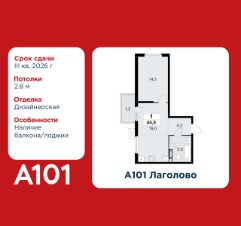 1-комнатная квартира площадью 44.80 в ЖК "А101 Лаголово" c балконом на 3 этаже. Квартира с отделкой. Вид из окна на улицу. В квартире 1 санузел. Высота потолков 2.8 м.