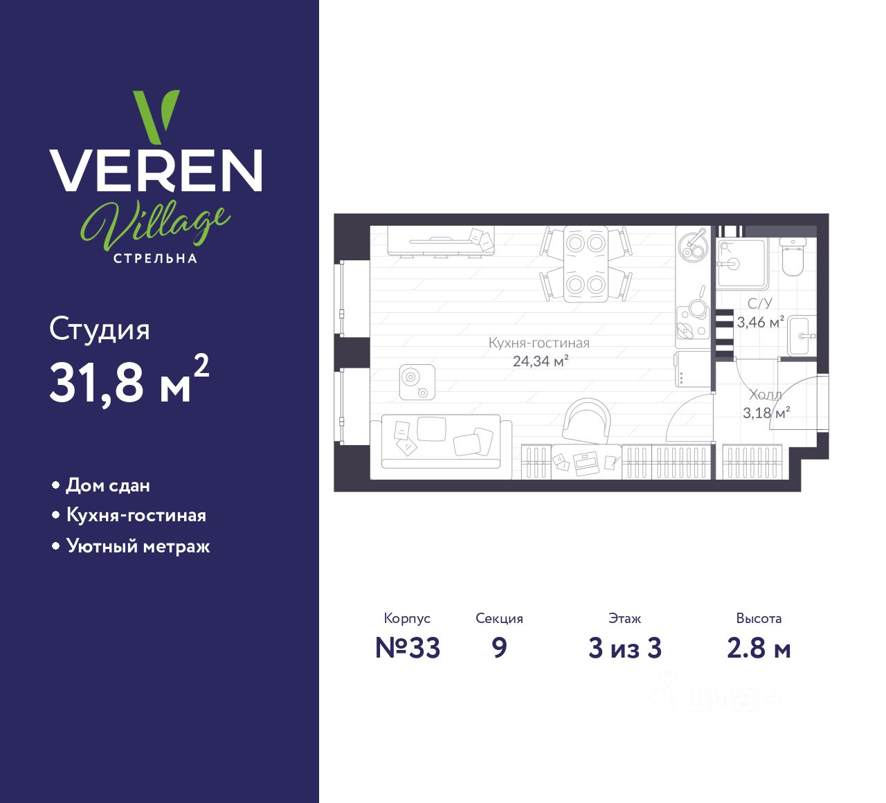 Однокомнатная квартира-студия в ЖК "VEREN VILLAGE Стрельна" на 3 этаже. Квартира без отделки, полностью готова к чистовой отделке и дальнейшему ремонту. Общая площадь: 31.8 кв.м., площадь гостиной 24.34 кв.м., из которых 5 кв.м. выделено под кухонную зону. Все окна выходят на одну сторону. В квартире один совмещенный санузел. Высота потолков 2.8 м.