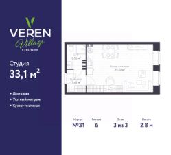 Однокомнатная квартира-студия в ЖК "VEREN VILLAGE Стрельна" на 3 этаже. Квартира без отделки, полностью готова к ремонту. Общая площадь: 33.1 кв.м., площадь гостиной 25.63 кв.м., из которых 5 кв.м. выделено под кухонную зону. Все окна выходят на одну сторону. В квартире один совмещенный санузел. Высота потолков 2.8 м.