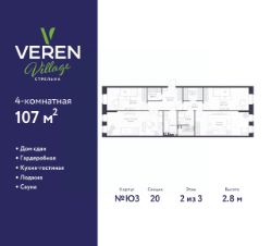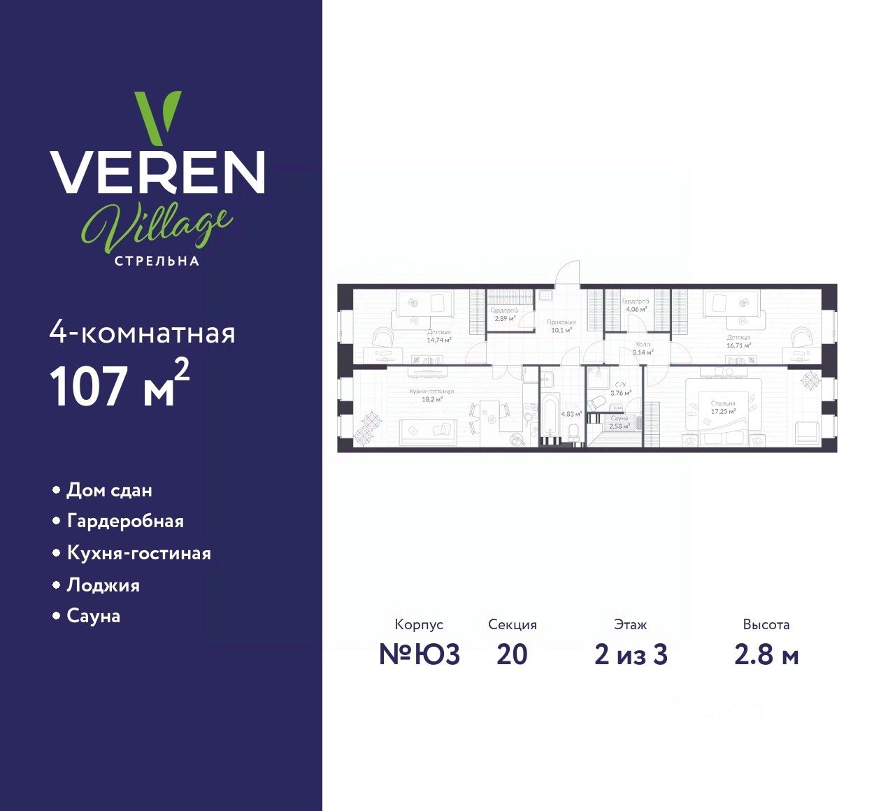 Продается 3-комн. квартира в ЖК "VEREN VILLAGE Стрельна" на 2 этаже. Квартира без отделки, после выдачи ключей можно делать ремонт. Общая площадь: 107 кв.м., жилая: 48.7 кв.м., площадь просторной куxни-гостиной: 18.2 кв.м. Квартира - распашонка, без проходных комнат, окна выходят на paзные стороны дома. В квартире два совмещенных санузла. Высота потолков 2.8 м.