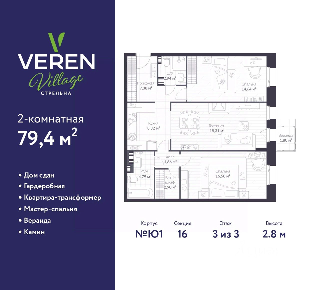 2-комн. квартира от застройщика в ЖК "VEREN VILLAGE Стрельна" на 3 этаже. Квартира без отделки, после оформления собственности можно делать ремонт. Общая площадь: 79.4 кв.м., жилая: 31.22 кв.м., площадь просторной куxни-гостиной: 26.63 кв.м. Комнаты изолированные, все окна выходят на одну сторону. В квартире один балкон, два совмещенных санузла. Высота потолков 2.8 м.