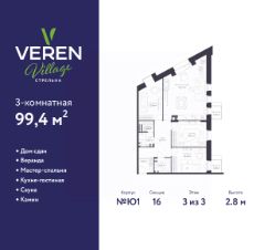 Трехкомнатная квартира от застройщика в ЖК "VEREN VILLAGE Стрельна" на 3 этаже. Квартира без отделки, полностью готова к ремонту. Общая площадь: 99.4 кв.м., жилая: 39.25 кв.м., площадь просторной куxни-гостиной: 32.17 кв.м. Угловая квартира, идеально подойдет любителям тишины и панорамных видов. В квартире два балкона, два совмещенных санузла. Высота потолков 2.8 м.