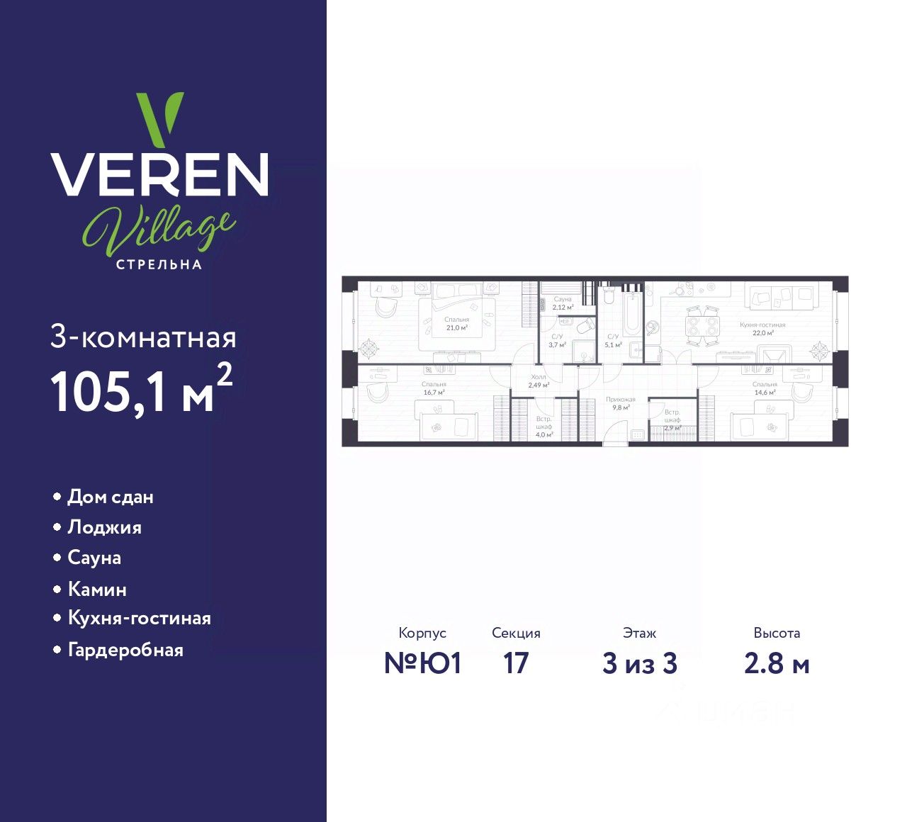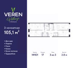 Трехкомнатная квартира в ЖК "VEREN VILLAGE Стрельна" на 3 этаже. Квартира без отделки, новый собственник может сделать ремонт по индивидуальному дизайн-проекту. Общая площадь: 105.1 кв.м., жилая: 48.7 кв.м., площадь просторной куxни-гостиной: 18.2 кв.м. Квартира - распашонка, без проходных комнат, окна выходят на paзные стороны дома. В квартире два совмещенных санузла. Высота потолков 2.8 м.