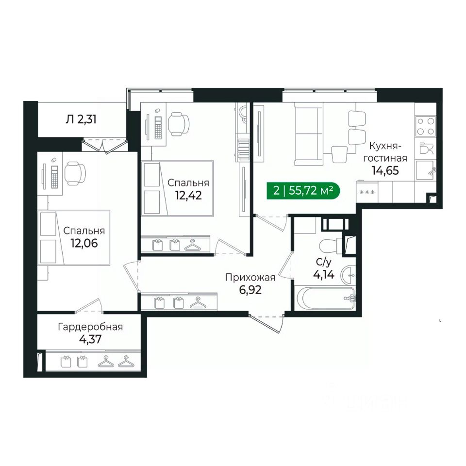 Наличие двух отдельных комнат позволяет обустроить спальню, гостиную или детскую комнату.