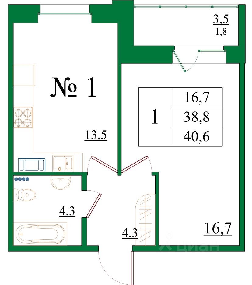 Продаётся 1-комнатная квартира в сданном доме (Корпус 2), срок сдачи: IV-кв. 2024, общей площадью 40.6 кв.м., на 7 этаже.