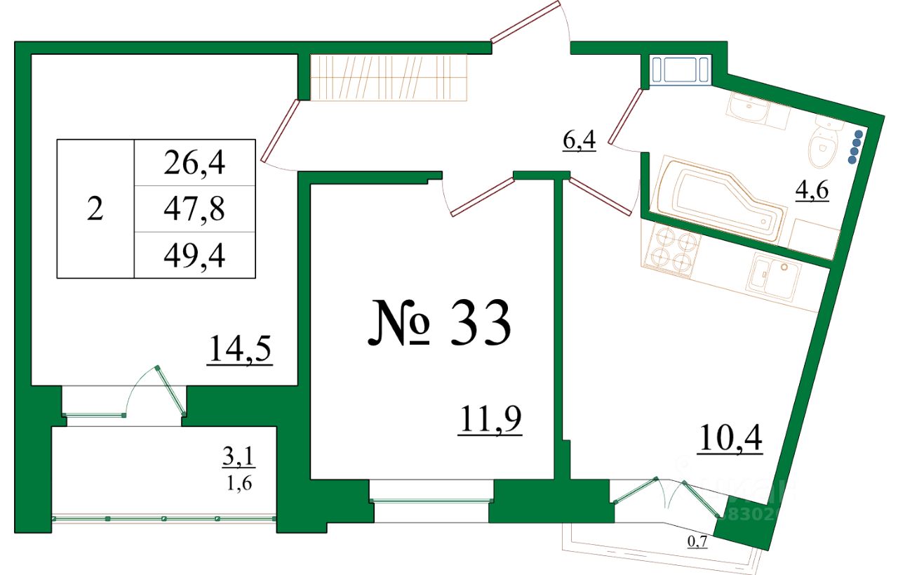 Продаётся 2-комнатная квартира в сданном доме (Корпус 2), срок сдачи: IV-кв. 2024, общей площадью 49.4 кв.м., на 8 этаже.