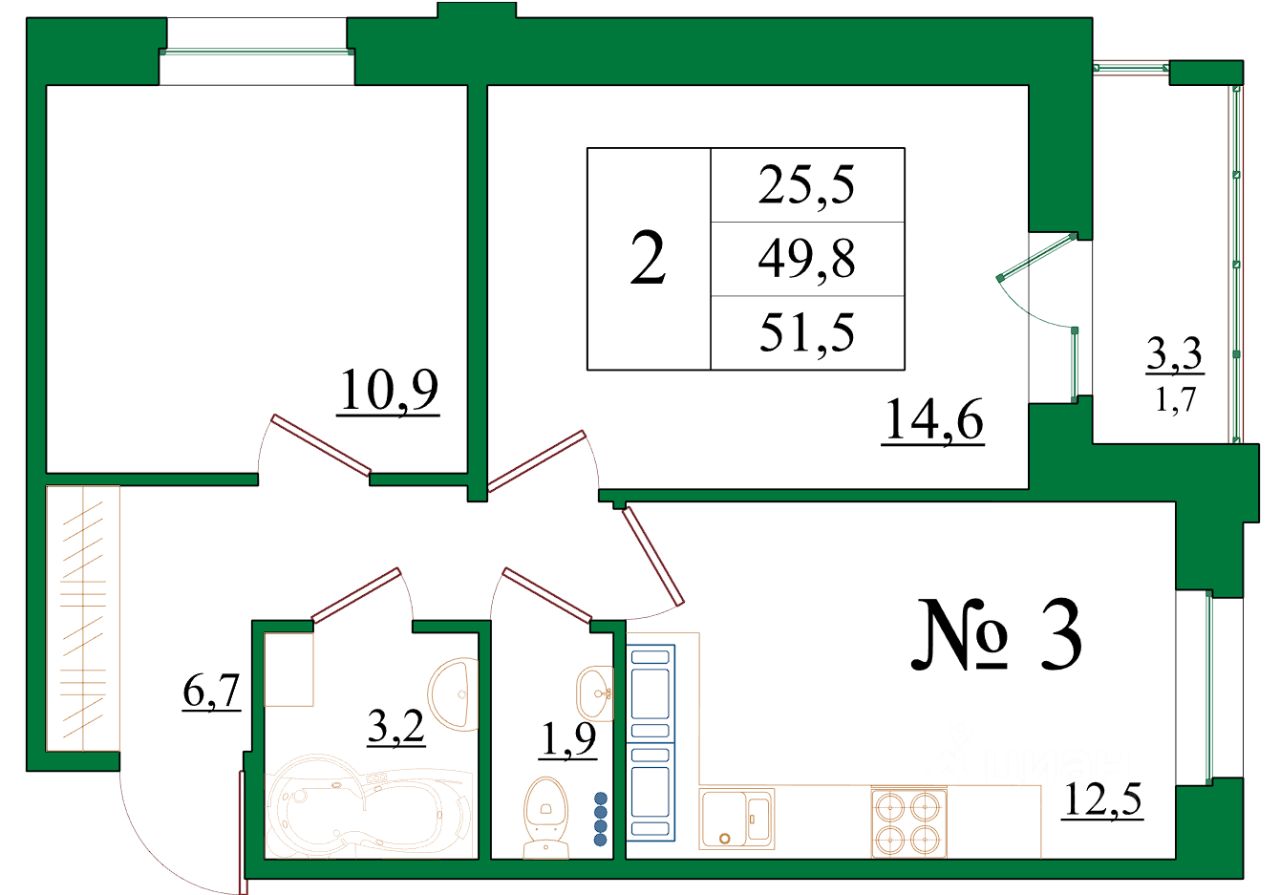 Продаётся 2-комнатная квартира в сданном доме (Корпус 2), срок сдачи: IV-кв. 2024, общей площадью 51.5 кв.м., на 3 этаже.
